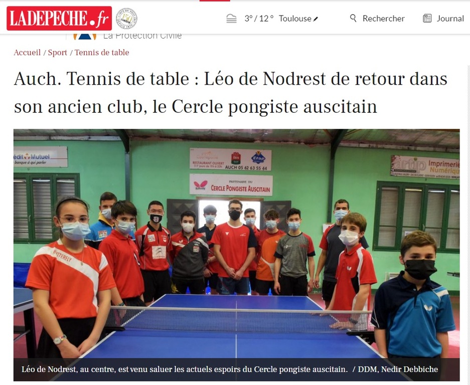 Au détour d’un entraînement, une bonne surprise attendait les espoirs du Cercle pongiste auscitain. Léo de Nodrest est venu rendre visite, jeudi dernier, aux jeunes pongistes qui s’exercent dans la salle du Mouzon, tout comme lui des années auparavant. Désormais professionnel au club de Thorigné-Fouillard (Pro B), il "revient tous les 2 ou 3 mois dans le Gers". Âgé de 20 ans, Léo de Nodrest a grandi à Auch, là où sa famille réside toujours. Au CPA, l’enfant prodige a commencé le tennis de table en 2009. Quatre ans plus tard, il rejoint l’INSEP à Paris et le club de Boulogne-Billancourt. "Léo avait besoin de joueurs de son niveau pour continuer à progresser. On ne pouvait pas le retenir", commente fièrement Bruno Carvalho, responsable technique du CPA. Le palmarès de l’athlète l’appuie : Champion d’Europe par équipes cadets puis vice-champion de France simples cadets en 2015 et médaillé de bronze en double mixte juniors aux Championnats d’Europe en 2018.