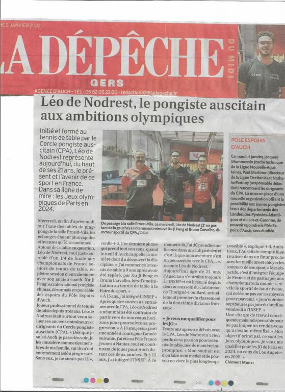 Ce mardi 4 janvier, Jacques Mommessin (cadre technique de la Ligue Nouvelle-Aquitaine), Paul Martinez (directeur de la Ligue Occitanie) et Nathalie Fortuny (responsable détection) rencontrent les dirigeants du CPA. La mise en place d’une nouvelle organisation offrant la possibilité aux jeunes pongistes issus des départements des Landes, des Pyrénées-Atlantiques et du Lot-et-Garonne, de pouvoir rejoindre le Pôle Espoirs d’Auch, sera étudiée.