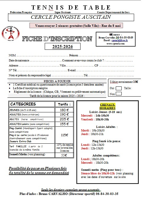 Bonjour, vous trouverez ci-joint les créneaux d'entraînements du Cercle Pongiste Auscitain pour la Saison 2025-2026